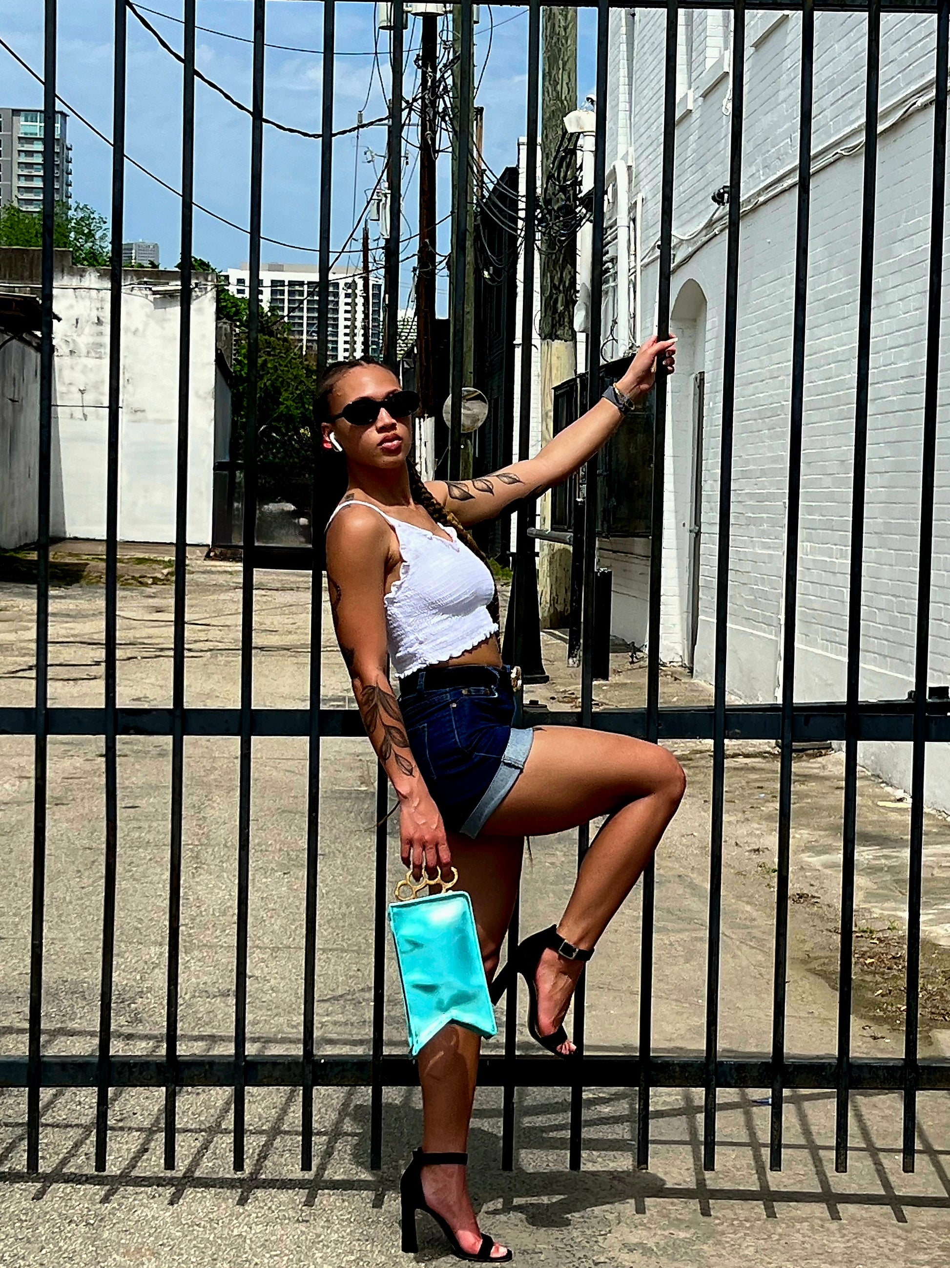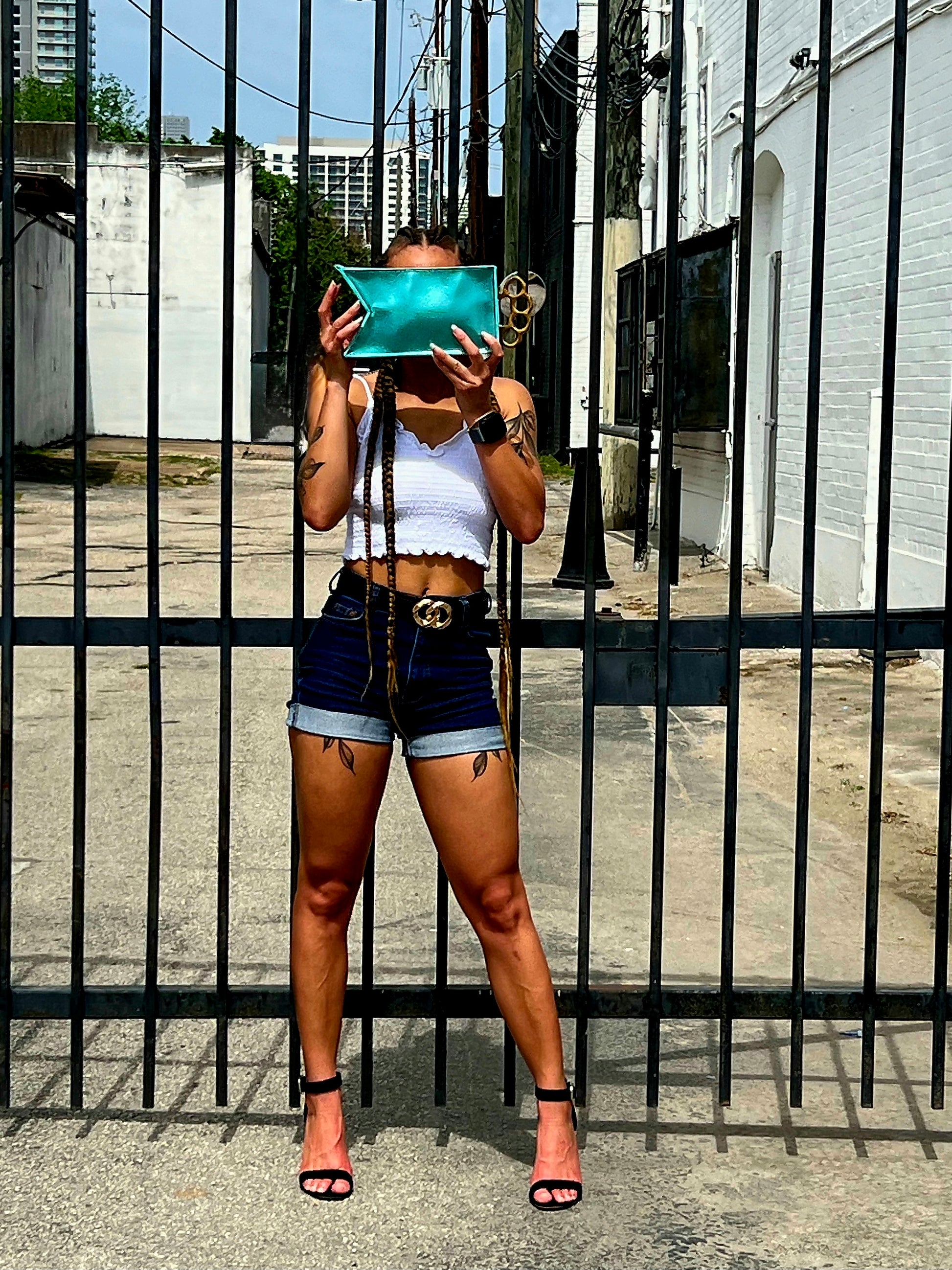 Italian leather clutch in metallic teal with decorative handle. Fully lined.