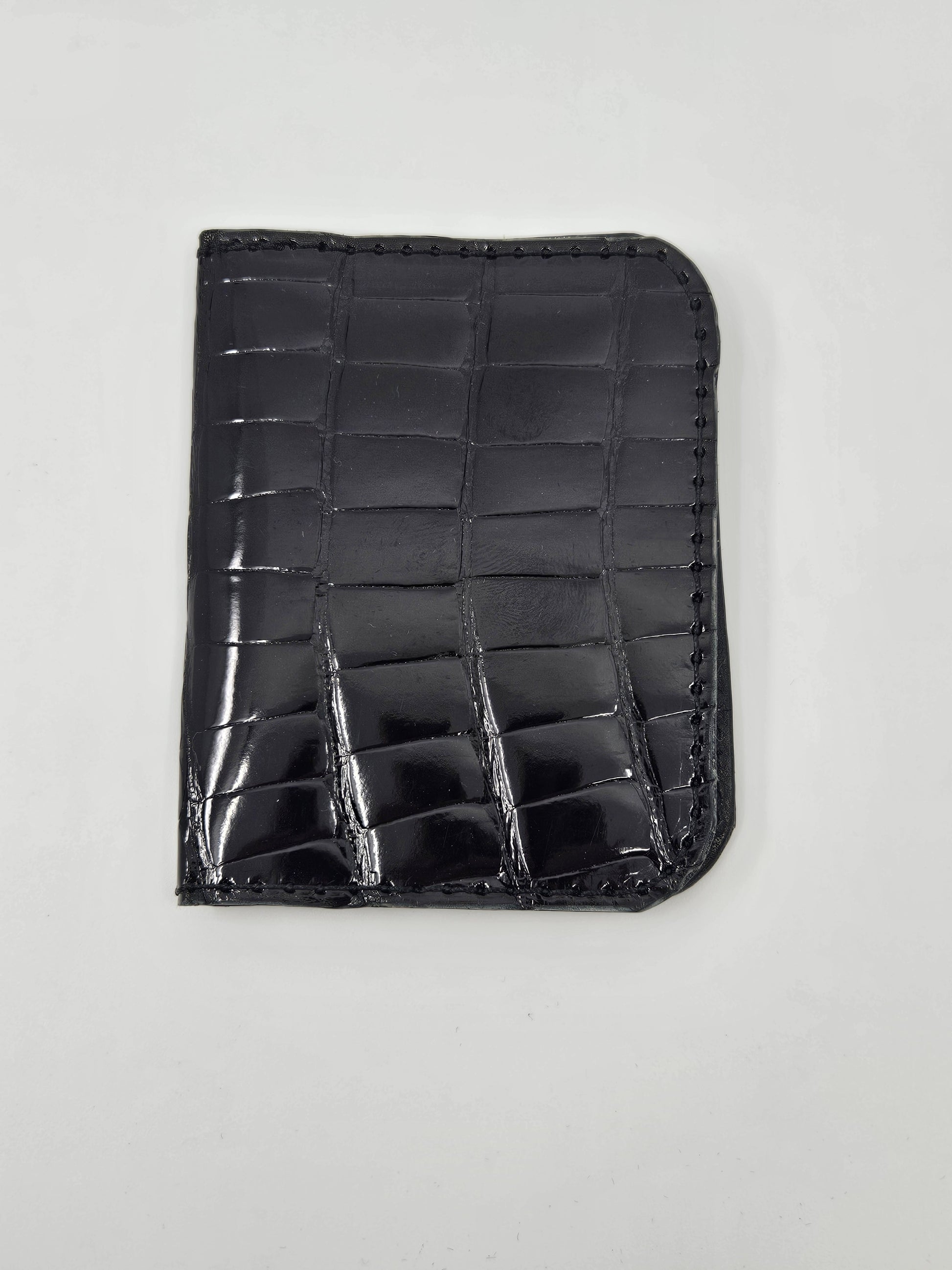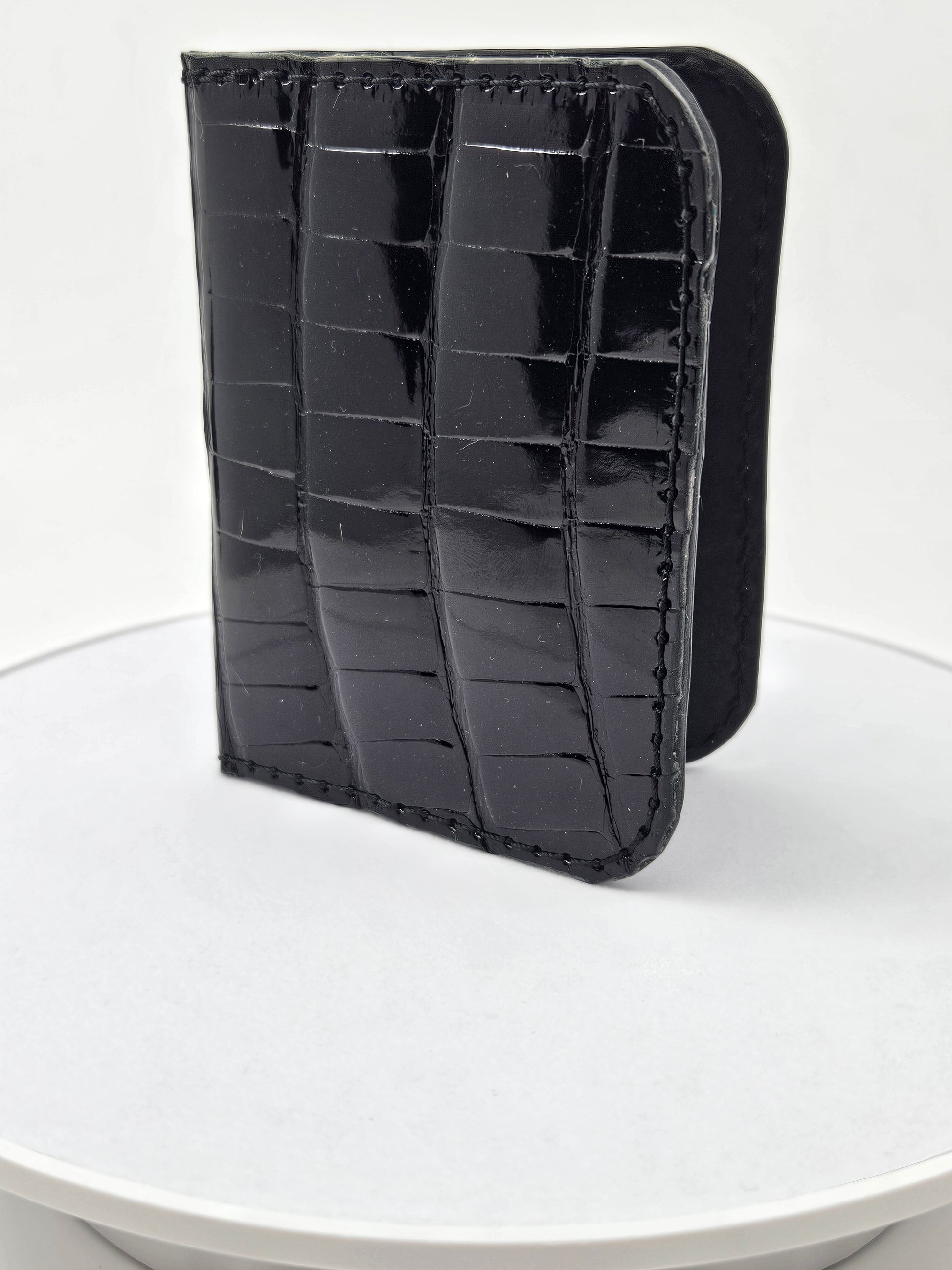 Glazed black American alligator exterior, Italian leather interior. The shine will fade after time into a beautiful patina.