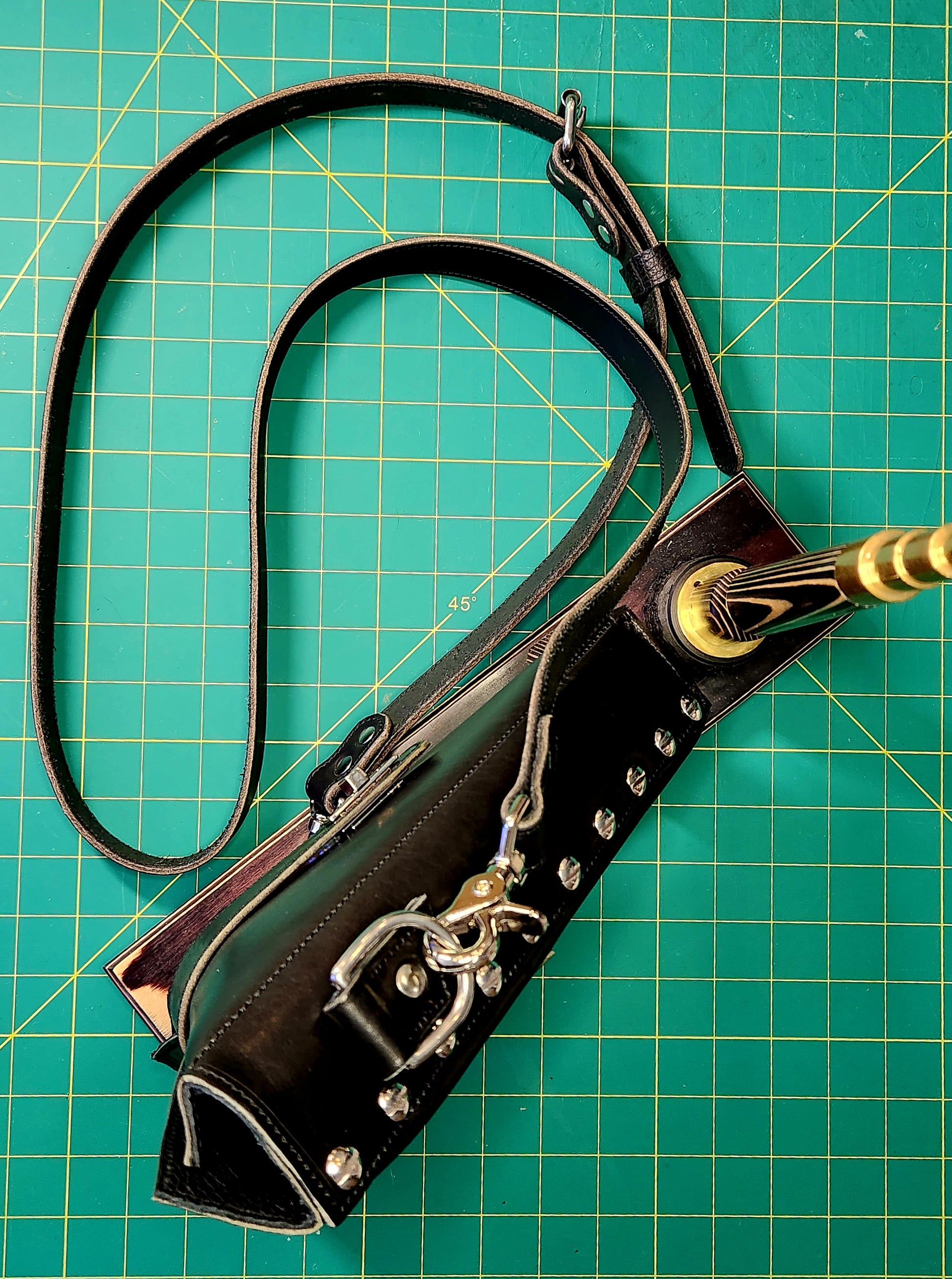 Triangle Bag in Black Italian vegetable tanned leather. Fully lined with an interior pocket. Comes with both a wristlet and shoulder strap. Choose between Solid Brass and Stainless Steel hardware.
